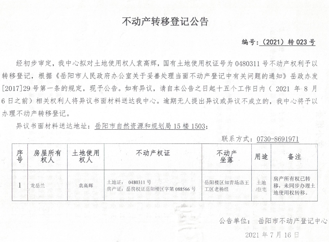 不动产转移登记公告 编号(2021)转023号(袁高辉)