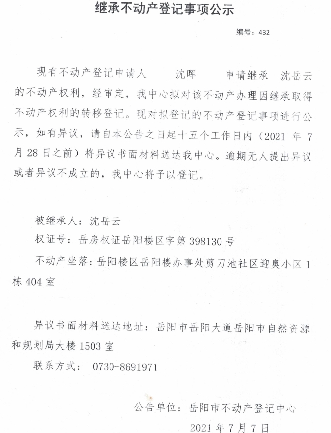 继承不动产登记公示 编号:(2021)继432(沈晖)
