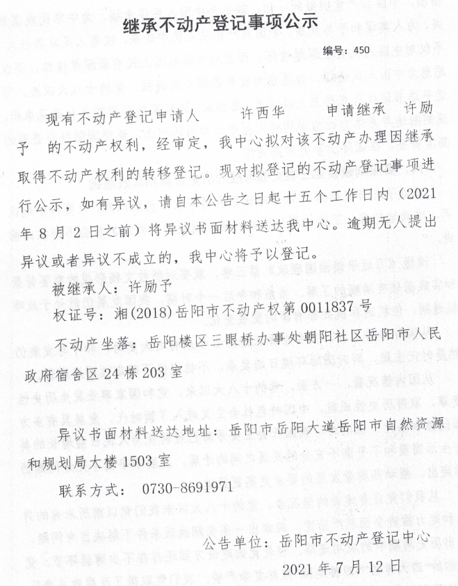 继承不动产登记公示 编号:(2021)继450(许西华)