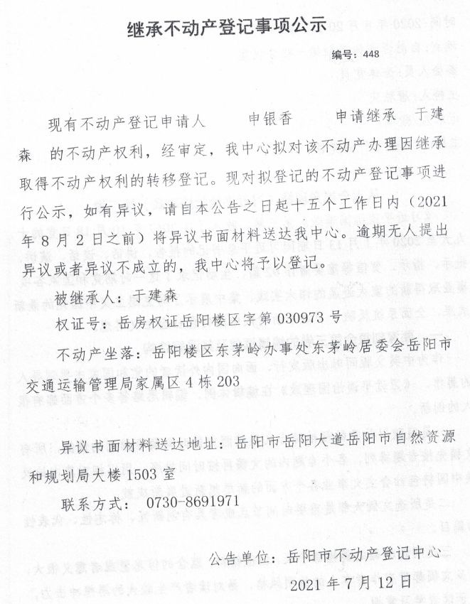 继承不动产登记公示 编号:(2021)继448(申银香)