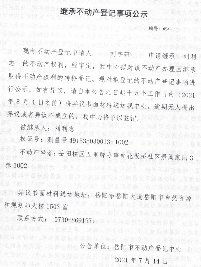 继承不动产登记公示 编号:(2021)继454(刘宇轩)