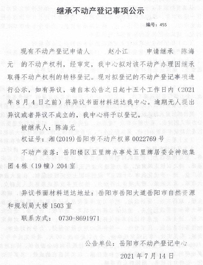 继承不动产登记公示 编号:(2021)继455(赵小江)