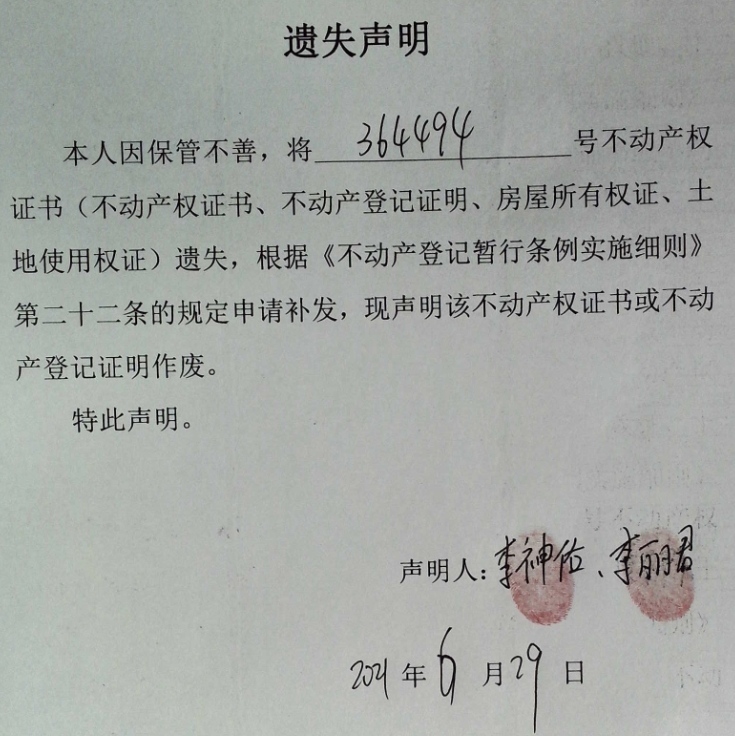 遗失声明(李神佑、李丽君)