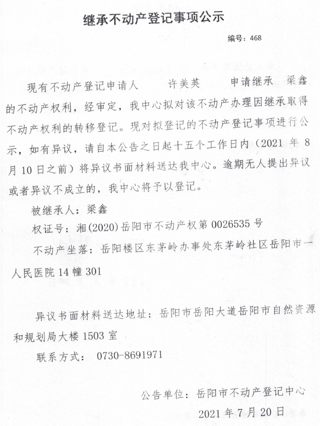 继承不动产登记公示 编号:(2021)继468(许美英)