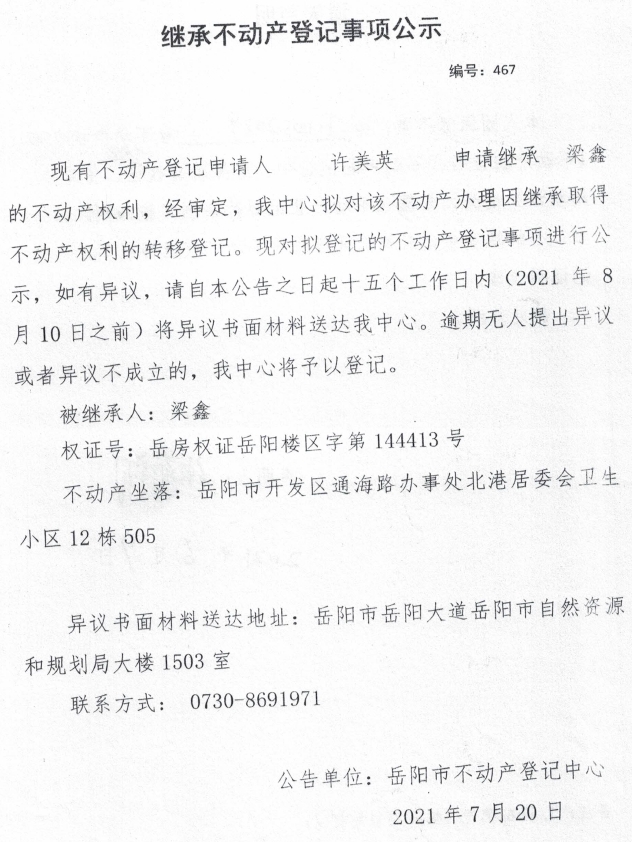 继承不动产登记公示 编号:(2021)继467(许美英)