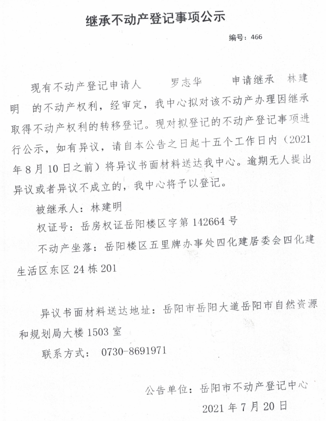继承不动产登记公示 编号:(2021)继466(罗志华)