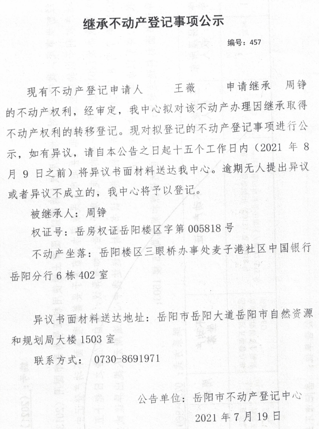 继承不动产登记公示 编号:(2021)继457(王薇)