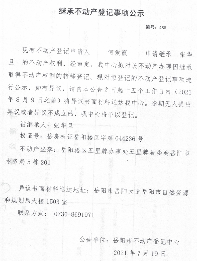 继承不动产登记公示 编号:(2021)继458(何爱霞)