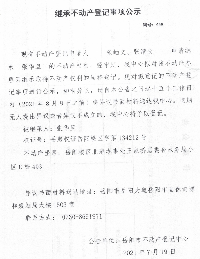 继承不动产登记公示 编号:(2021)继459(张清文)