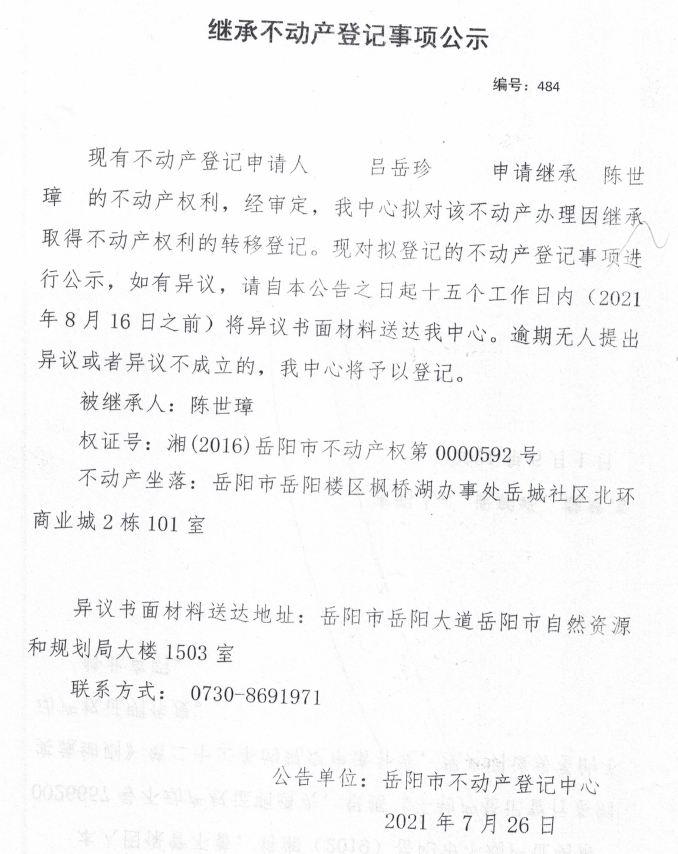 继承不动产登记公示 编号:(2021)继484(吕岳珍)
