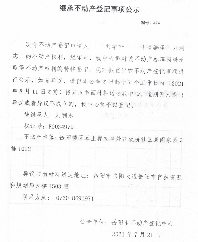 继承不动产登记公示 编号:(2021)继474(刘宇轩)