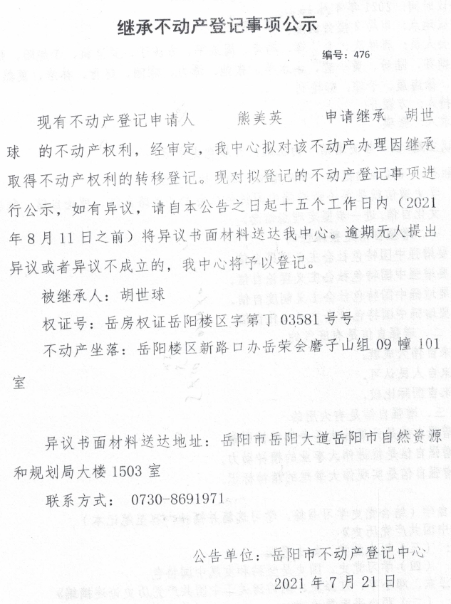 继承不动产登记公示 编号:(2021)继476(熊美英)