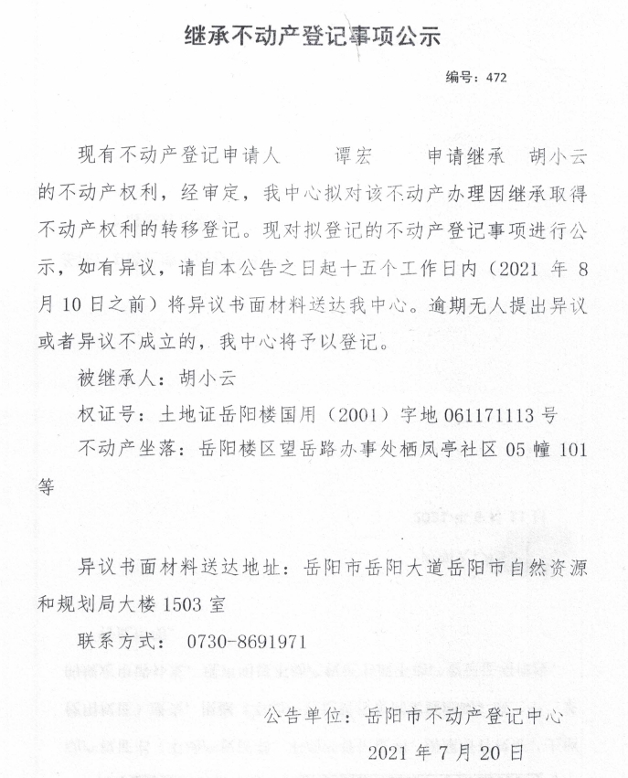 继承不动产登记公示 编号:(2021)继472(谭宏)