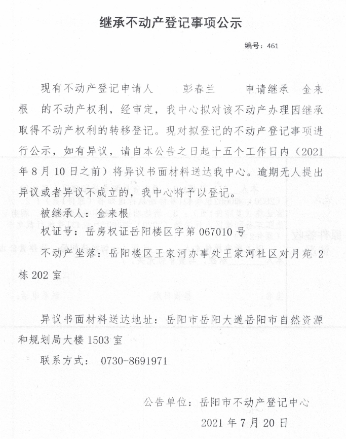 继承不动产登记公示 编号:(2021)继461(彭春兰)