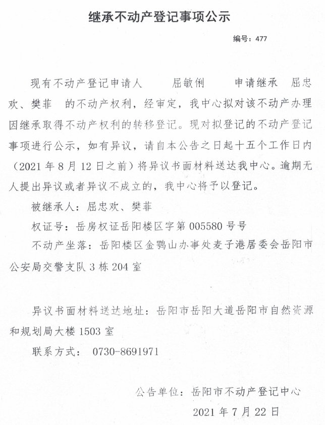 继承不动产登记公示 编号:(2021)继477(屈敏俐)