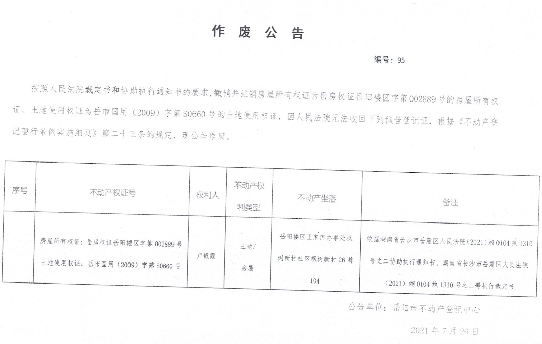 作废公告 编号:95(卢银霞)