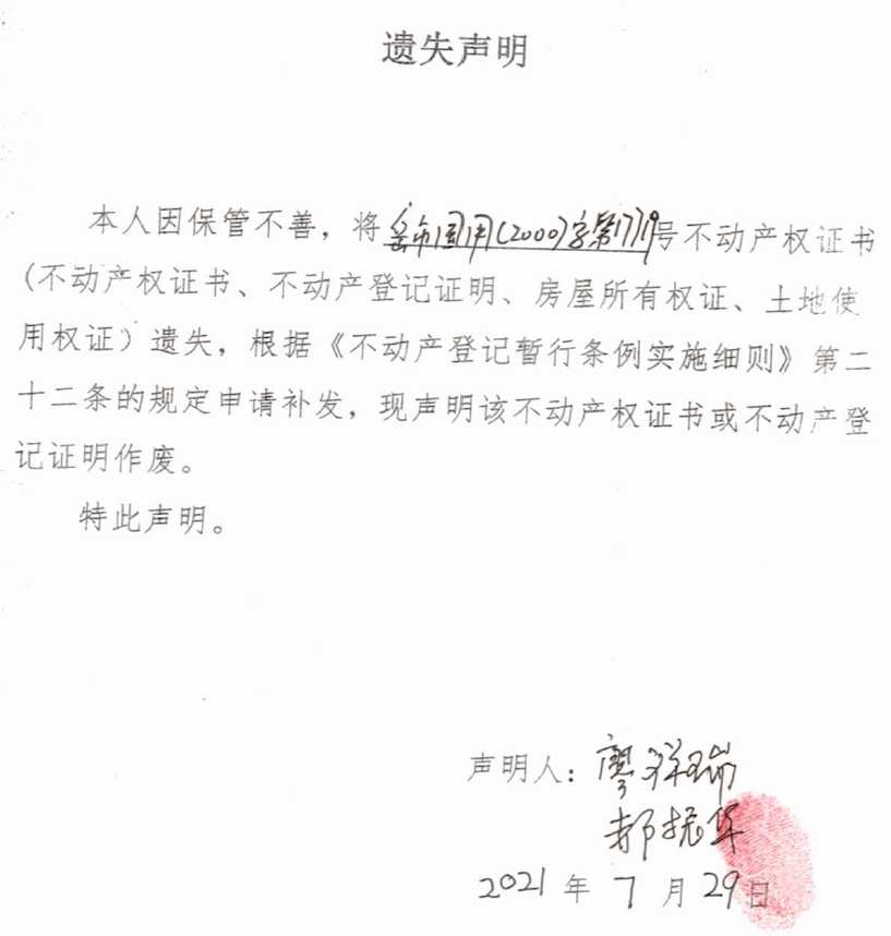 遗失声明(廖祥瑞、郝振华)