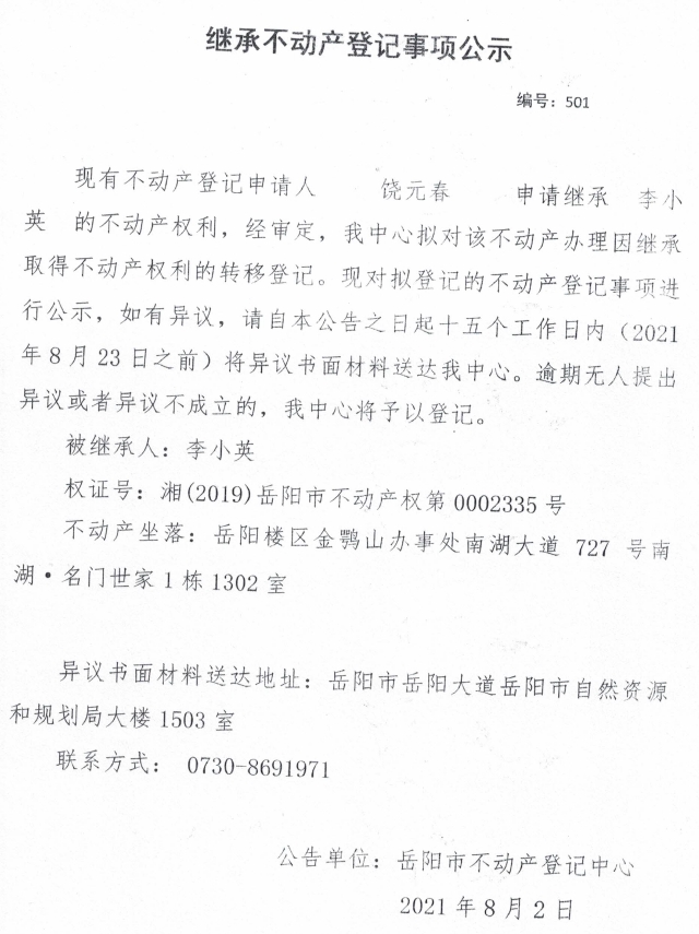 继承不动产登记公示 编号:(2021)继501(饶元春)