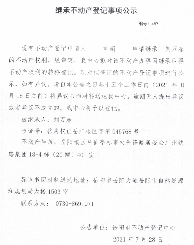 继承不动产登记公示 编号:(2021)继487(刘娟)
