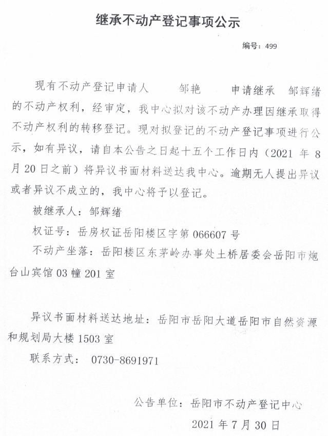 继承不动产登记公示 编号:(2021)继499(邹艳)
