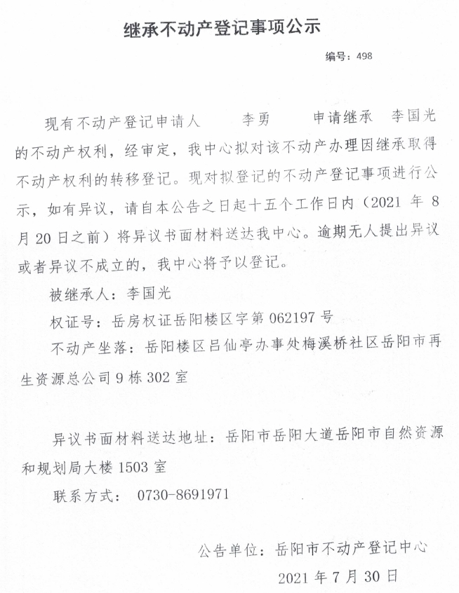 继承不动产登记公示 编号:(2021)继498(李勇)