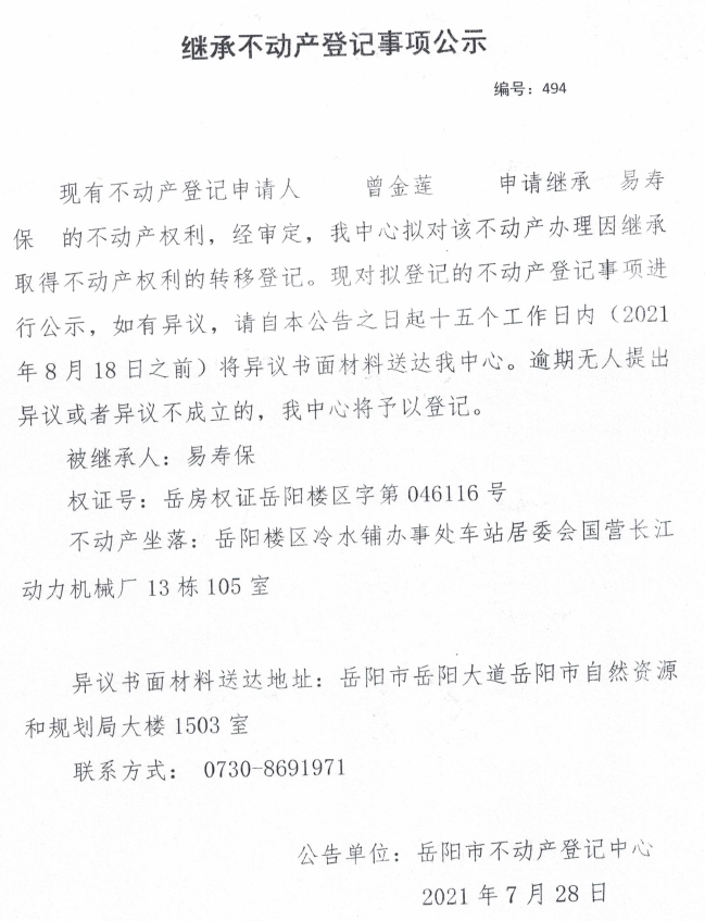 继承不动产登记公示 编号:(2021)继494(曾金莲)