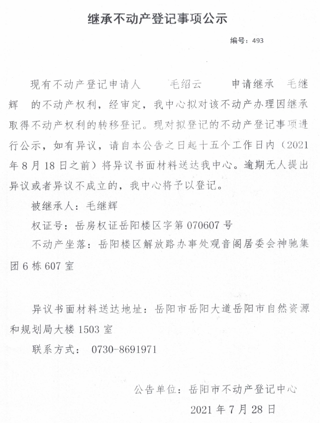 继承不动产登记公示 编号:(2021)继493(毛绍云)