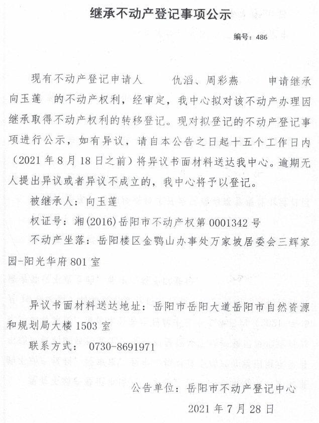 继承不动产登记公示 编号:(2021)继486(周彩燕)