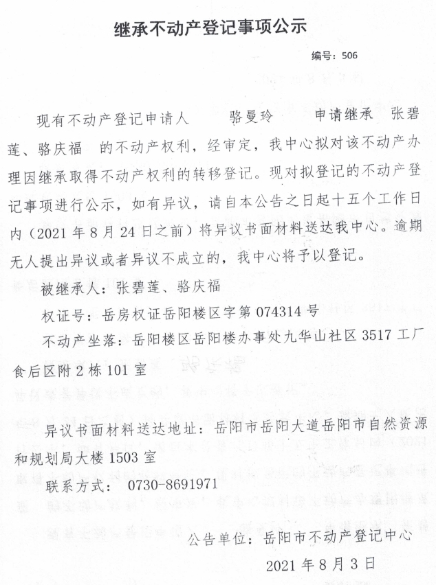 继承不动产登记公示 编号:(2021)继506(骆曼玲)