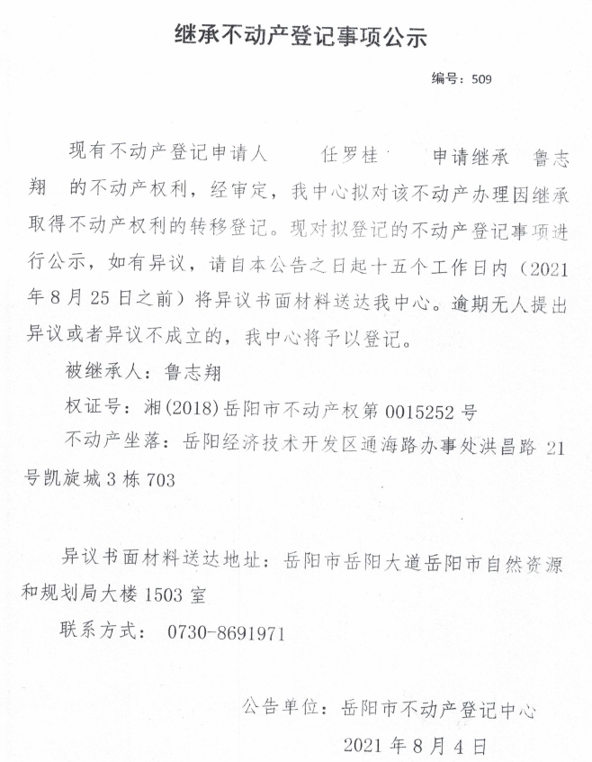 继承不动产登记公示 编号:(2021)继509(任罗桂)