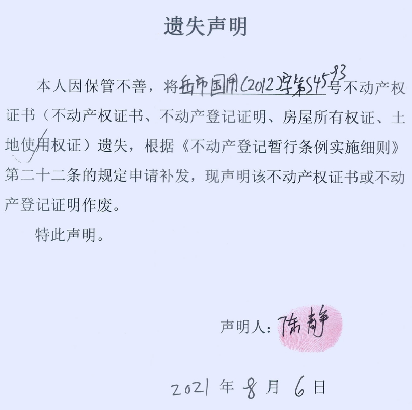 遗失声明(陈静)