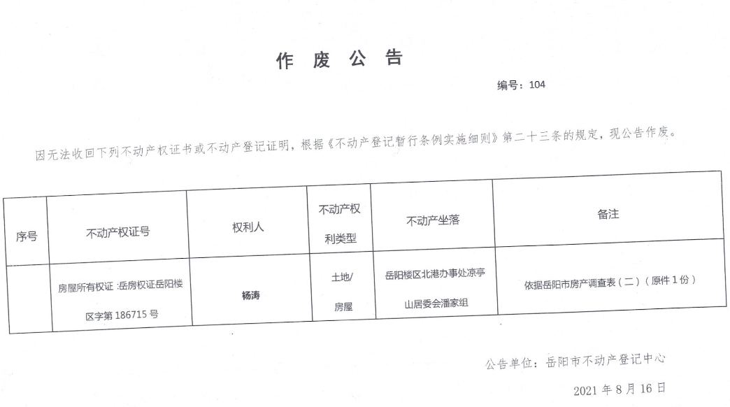 作废公告 编号:104(杨涛)