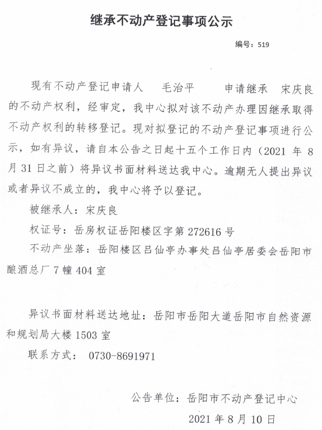 继承不动产登记公示 编号:(2021)继519(毛治平)