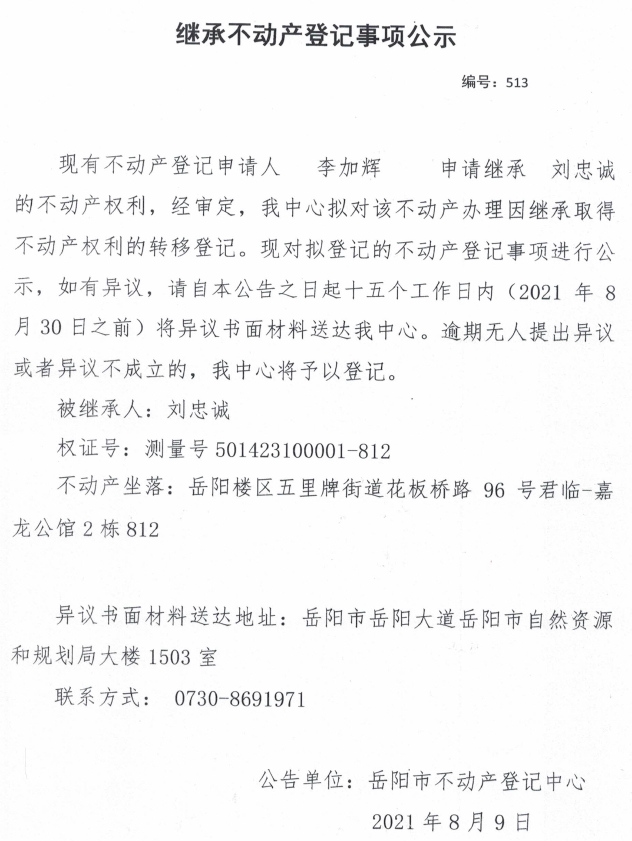 继承不动产登记公示 编号:(2021)继513(李加辉)