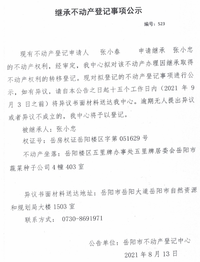 继承不动产登记公示 编号:(2021)继523(张小春)