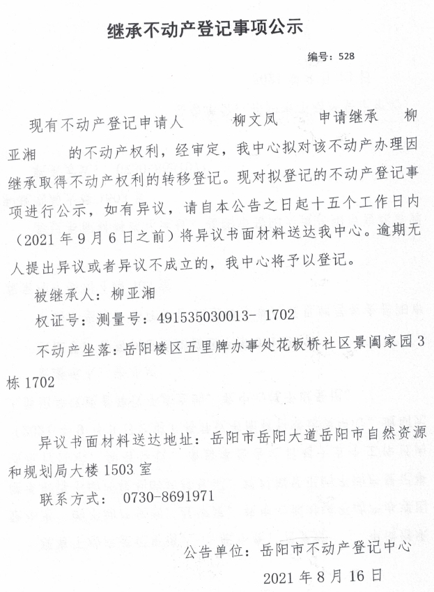 继承不动产登记公示 编号:(2021)继528(柳文凤)