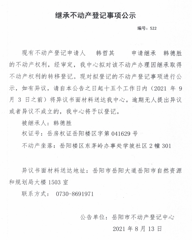 继承不动产登记公示 编号:(2021)继522(韩哲其)