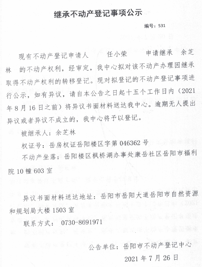 继承不动产登记公示 编号:(2021)继531(任小荣)