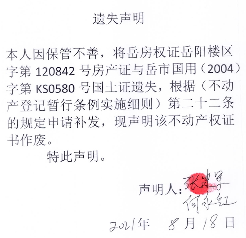遗失声明(何永红、张建军)