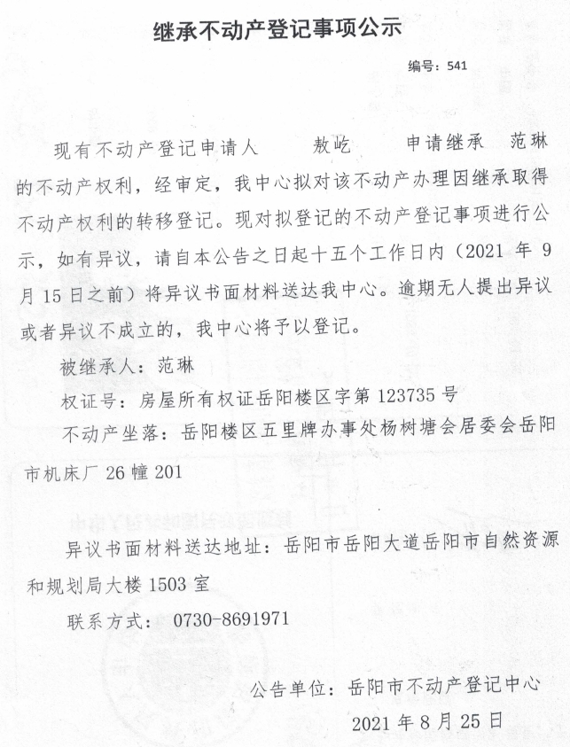 继承不动产登记公示 编号:(2021)继541(敖屹)