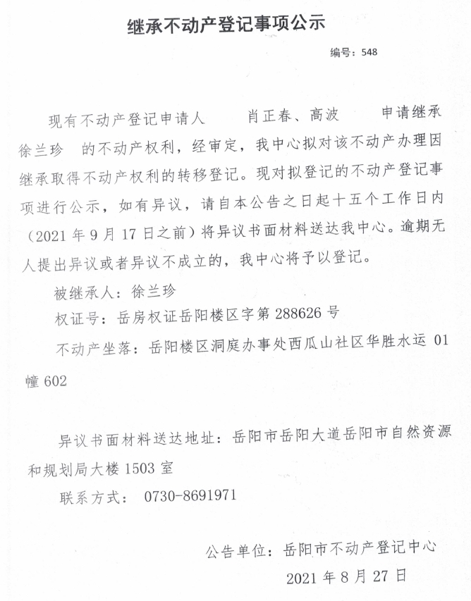 继承不动产登记公示 编号:(2021)继548(肖正春)