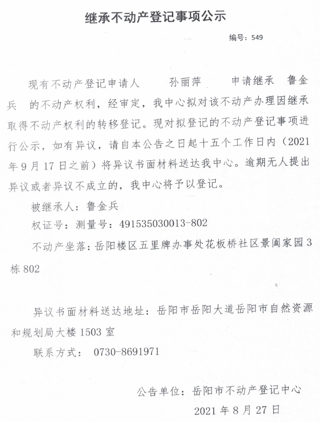 继承不动产登记公示 编号:(2021)继549(孙丽萍)