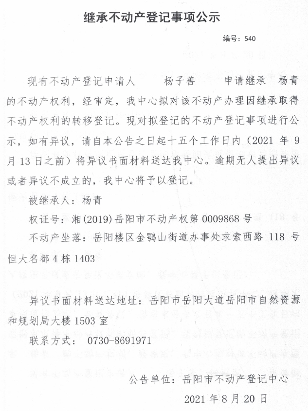 继承不动产登记公示 编号:(2021)继540(杨子善)