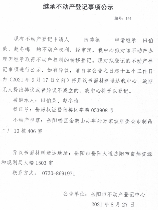 继承不动产登记公示 编号:(2021)继544(田美德)