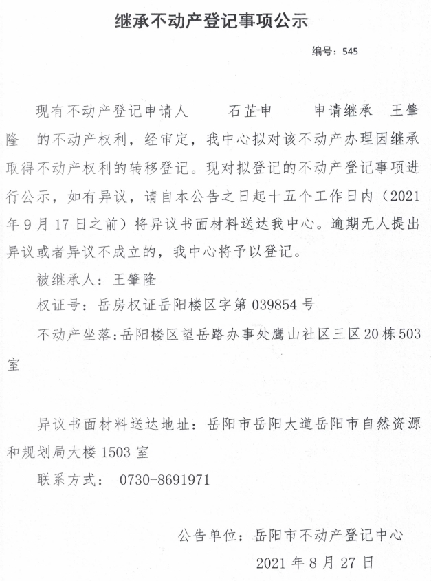 继承不动产登记公示 编号:(2021)继545(石芷申)