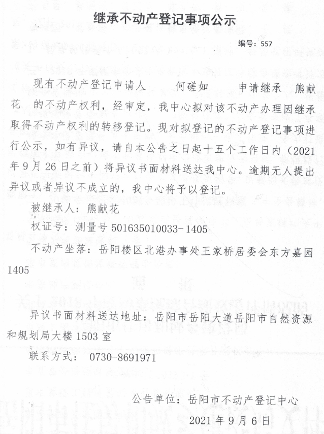 继承不动产登记公示 编号:(2021)继557(何磋如)