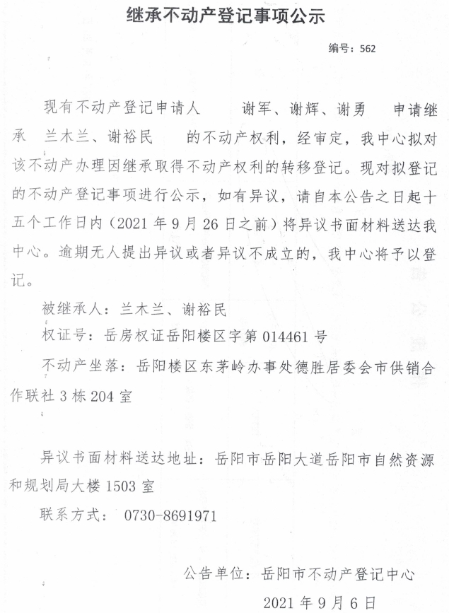 继承不动产登记公示 编号:(2021)继562(谢军)