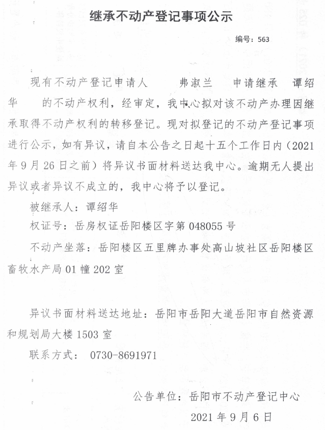继承不动产登记公示 编号:(2021)继563(弗淑兰)