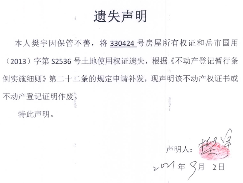 遗失声明(樊宇)