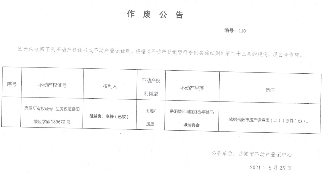 作废公告 编号110(胡益良、李静(已故))